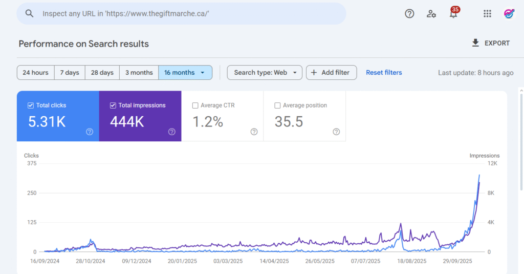 To further enhance product visibility, we integrated Google Merchant Centre, optimized listings for Bing Store, and focused on Google My Business growth. Seasonal campaigns like Diwali Gifts were strategically launched to capture festive search intent—resulting in a major spike in impressions and organic clicks.